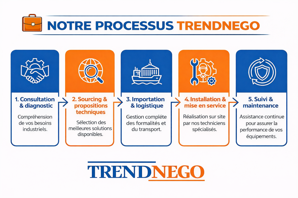 TRENDNEGO assure l’importation et la fourniture d’équipements industriels fiables et performants, adaptés aux besoins spécifiques de chaque secteur d’activité.